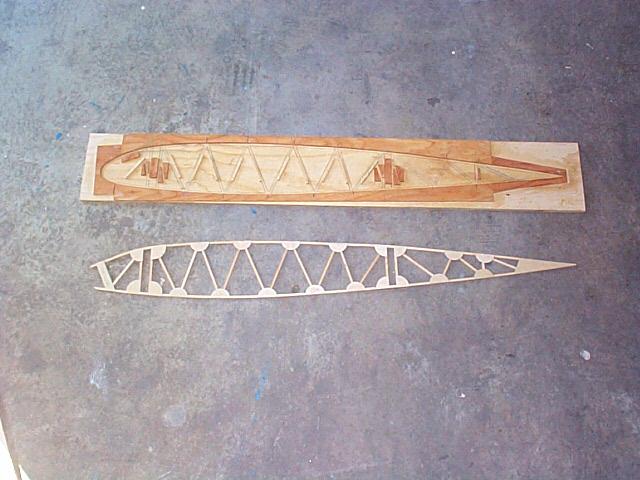 For those of you who are unfamiliar, the spindly assembly at the bottom is a wing rib, the skeletal element which defines the shape of the wing. The board at the top of the picture is the jig fixture which secures all the little rib pieces... I see more than 60 of them... in just the right position while they are glued.