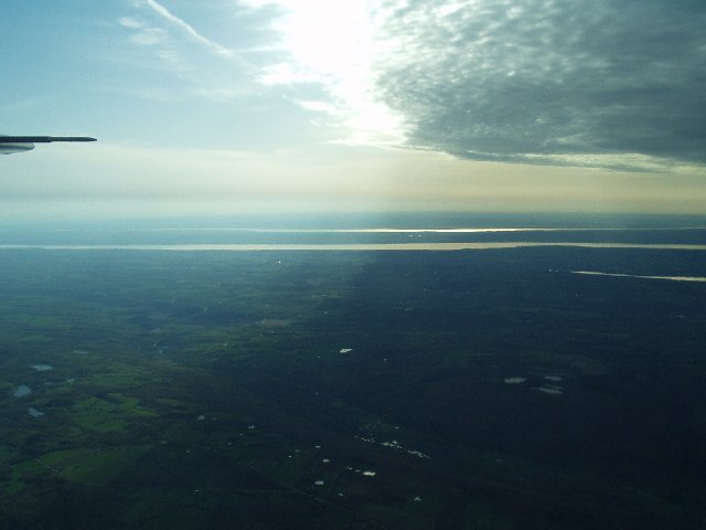 The drama was purely visual, merely the beginning of the cloud cover that gave us rain by nightfall and for Sunday morning. The edge of the clouds was unusually well defined though, and laid at right angles to my course. I took a picture out my side window as I passed under it; to the left, behind me, the sky was bright and the land below was a vibrant shade of springtime green. To the right, ahead of me, the sky was darkened with cloud, and the land barely visible to the camera. Only the long thin lines of the lakes stood out from the shadow.