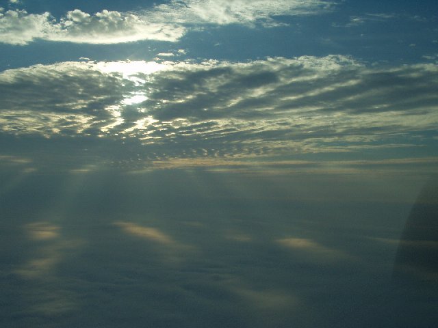 This year produced a dull winter for picture- taking. In early January I took some nice pictures of the shadows cast by higher clouds upon a layer of clouds below me. There was just enough haze in the air that each of the sunny spots on the undercast was linked to the upper clouds with the hint of a sunshaft. There is lots of beautiful sky to be seen from a hilltop or even a good back yard, but only an airplane can provide scenery such as this.