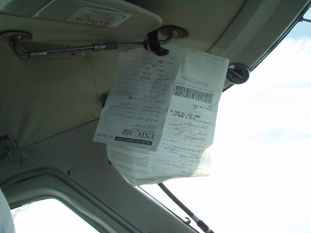 The paperwork doesn't end with the commencement of flight; you can't expect a pilot to sit alone in an airplane with nothing to do. The first order of business, just after clearing the airport area, is to figure the times for taxi, takeoff, and estimated arrival, and call them back to the loading crew. Then there is time to "do the laundry" if necessary... some of the wet papers are hung from a big clip on the sun visor and others are spread around the cabin so that they will dry before being stowed.